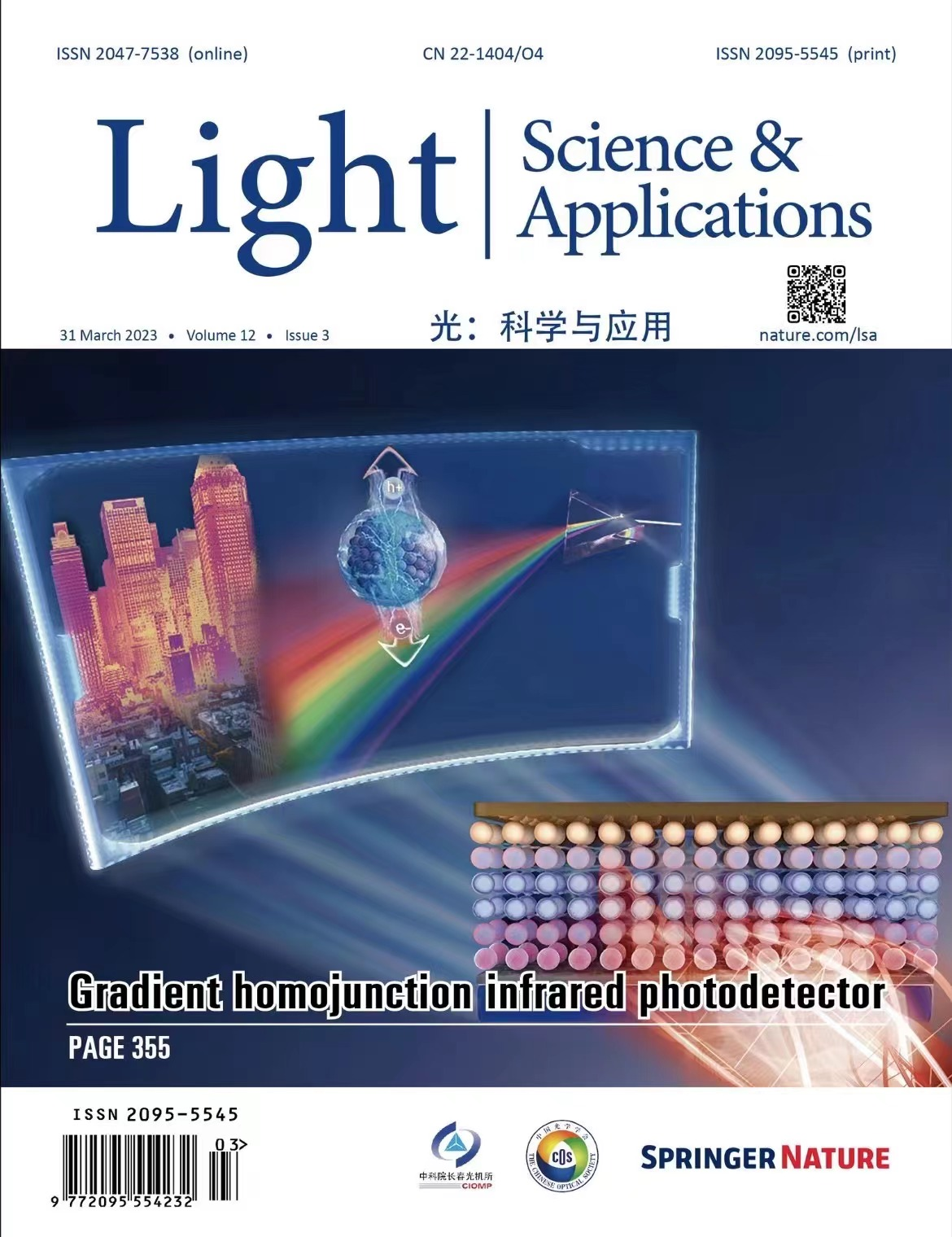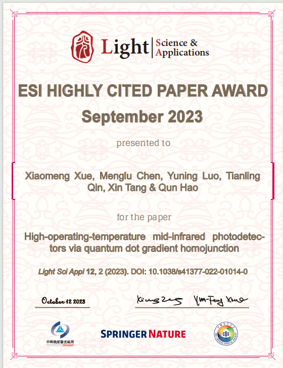 det365登录网站主页郝群教授团队在室温运行中波红外探测器研究方面取得了突破性的进展,相关论文于2023年1月发表于光学顶刊Light:Science & Applications,获得封面论文。近日该论文入选ESI高被引。 (https://www.nature.com/articles/s41377-022-01014-0)