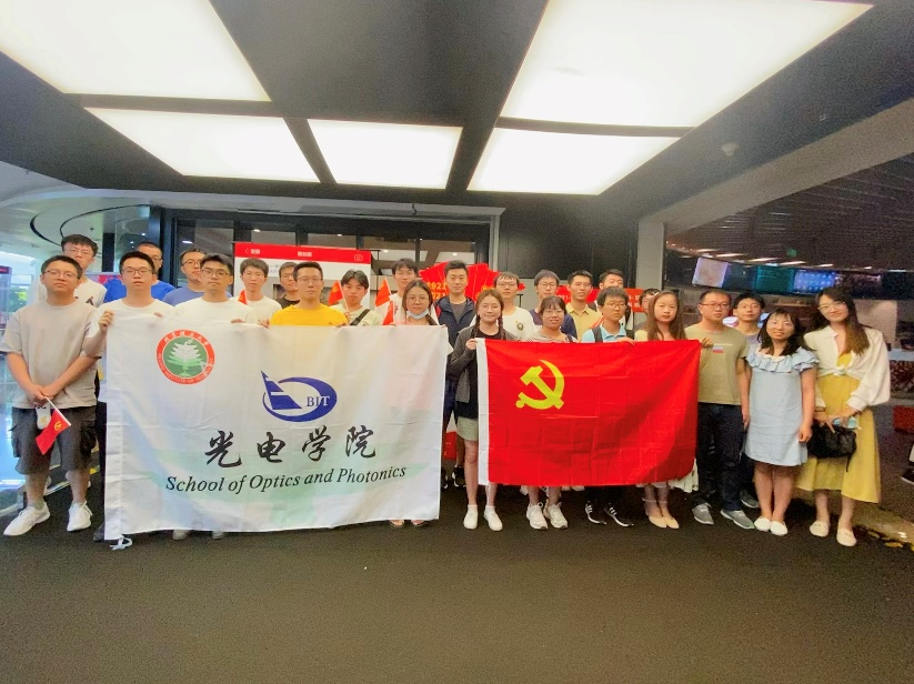 观影候场时,北理工2020级光工学硕2班党支部、清华大学机研201、171党支部的同志们手持党旗,在制作的建党100周年主题的立牌处进行拍照打卡留恋,以表达对党的祝福和对未来的希冀。在这样轻松和欢快的氛围中,各支部同志相互进行了密切且深入的交流,活动热情达到了高点。