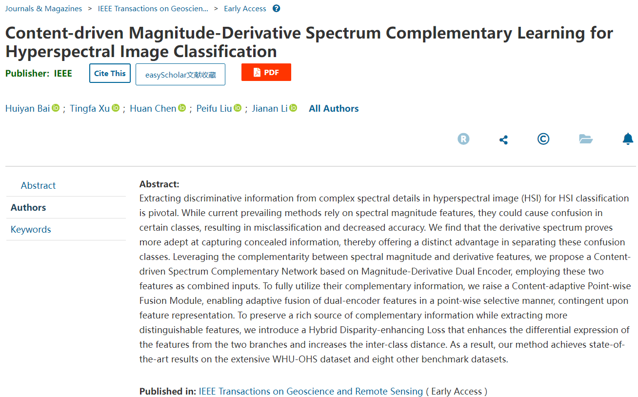 论文详情:H. Bai, T. Xu, H. Chen, P. Liu and J. Li, "Content-driven Magnitude-Derivative Spectrum Complementary Learning for Hyperspectral Image Classification," in IEEE Transactions on Geoscience and Remote Sensing, doi: 10.1109/TGRS.2024.3435079.