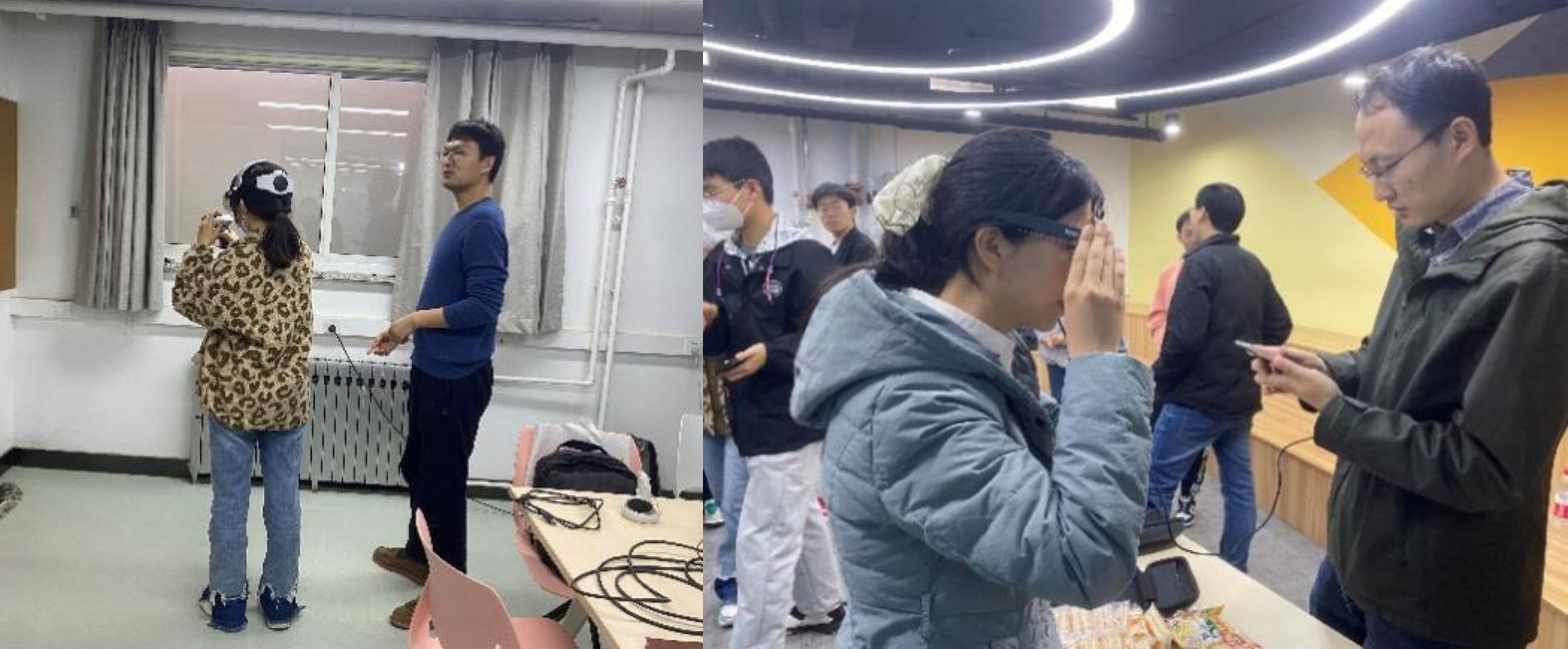 研究所的老师和研究生们为学生们准备了虚拟现实眼镜、增强现实眼镜、红外周视成像系统、视觉定位系统、超表面全息演示系统、可穿戴无线供电光电检测系统、柔性显示屏等最新科研成果的现场展示,吸引了同学们的围观和踊跃体验。