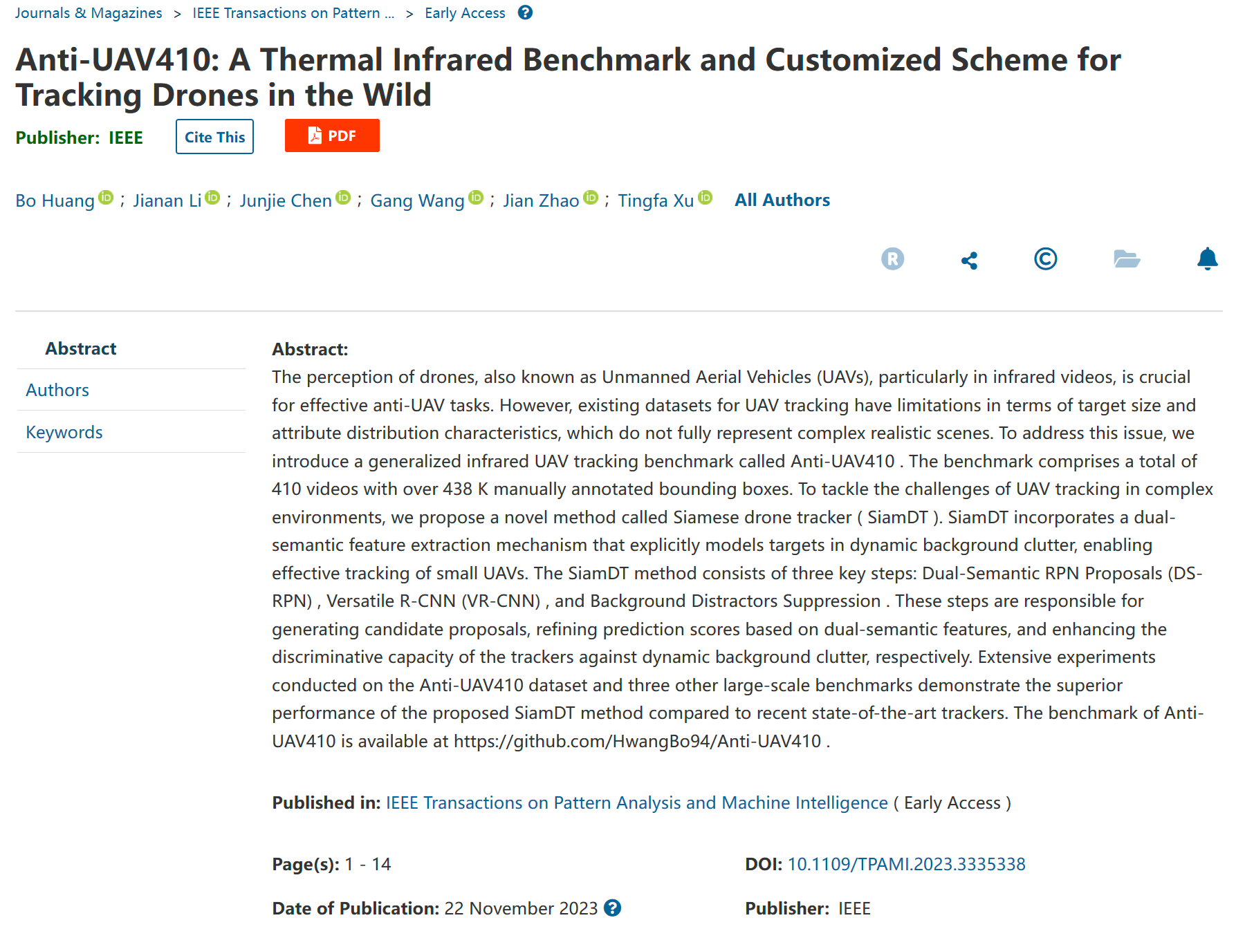 基于红外图像的智能目标探测技术是解决“低慢小”目标定位与跟踪的关键,同时也是国际学术前沿和国家重大工程需求。为了克服在复杂场景下红外小目标探测的难题,det365登录网站主页的许廷发教授科研团队进行了智能化红外小目标定位与跟踪方法的研究,取得了突破性进展。该研究成果以“Anti-UAV410: A Thermal Infrared Benchmark and Customized Scheme for Tracking Drones in the Wild”为题,已在国际顶级期刊《IEEE Transactions on Pattern Analysis and Machine Intelligence (TPAMI)》上发表。IEEE TPAMI作为人工智能、模式识别、图像处理等领域的顶级权威期刊,其影响因子为23.6,同时也是中国计算机协会(CCF)推荐的人工智能领域A类期刊。