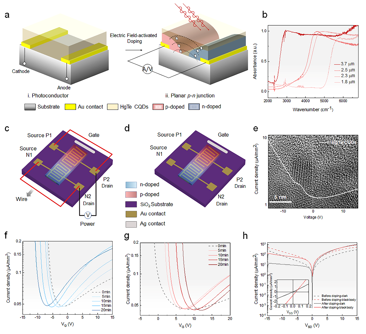 图1 电场激活原位掺杂平面光伏型胶体量子点红外成像芯片工作原理:(a)工作原理示意图。(b)碲化汞胶体量子点吸收光谱。(c、d)FET测量过程示意图。(e)碲化汞胶体量子点的高分辨率透射电子显微镜图像和薄膜的FET曲线。(f)正向电场和(g)反向电场激活下碲化汞胶体量子点薄膜的FET曲线。(h)电场激活原位掺杂过程后的器件电流-电压曲线。