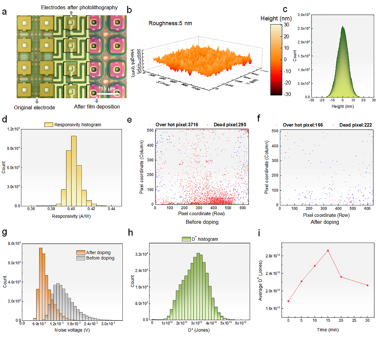 图3平面光伏型胶体量子点短波红外成像芯片:(a)红外成像芯片电极的光学显微图像。平面光伏型胶体量子点短波红外成像芯片的(b)原子力显微镜图像和(c)直方图。(d)平面光伏型胶体量子点短波红外成像芯片的响应度直方图。电场激活原位掺杂前后的成像芯片的(e、f)过热像元和死像元及(g)噪声直方图。平面光伏型胶体量子点短波红外成像芯片的(h)比探测率直方图和(i)平均比探测率-电场激活时间曲线。