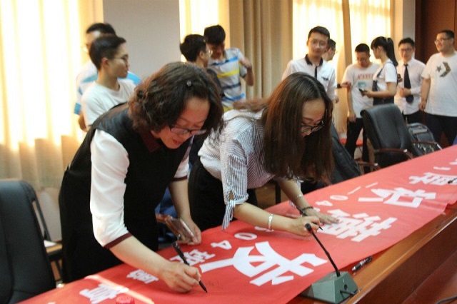 在答辩交流环节结束后,班长播放了同学们为此次交流会录制的视频,并公开揭晓“国王与天使”游戏的身份,彰显了班级的凝聚力。会议结尾,嘉宾及同学们在楷体条幅上签字留念。