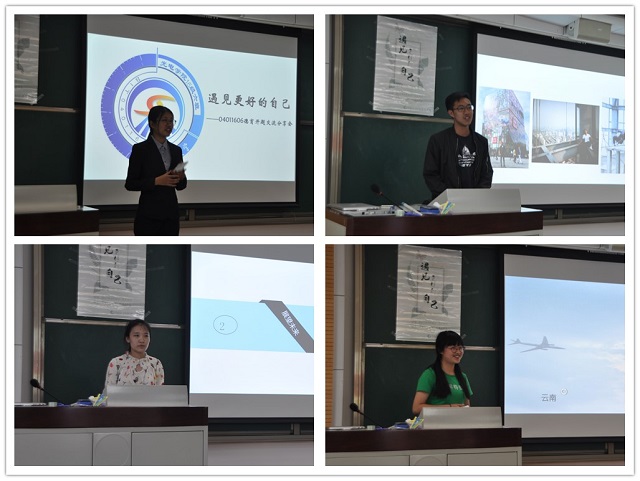 此次交流会在主持人胡晓的轻松谐趣的开场陈词中拉开了幕,在热烈的掌声中迎来了个人答辩环节。答辩环节按照同学的学号进行,首先上台的是卞潇临同学,在诙谐简介的ppt中向我们展示了他高中时期的照片,同时他用幽默的演讲分享了自己从高中时期到大学的成长过程,讲述了对今后大学生活的自我规划和定期目标。同学们在欢笑声中倾听了发言,交流会现场气氛严肃认真但不失愉悦。