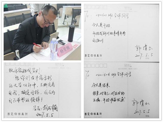 交流会结束后,副院长杨亚楠和辅导员郭倩玉都在明信片上写下了对04011606全体同学的祝福语,同时全体同学也在自己的明信片中写下了对自己勉励的一句话。04011606全体同学将以德育开题为契机,书写大学四年更加美好的篇章,遇见更好的自己。