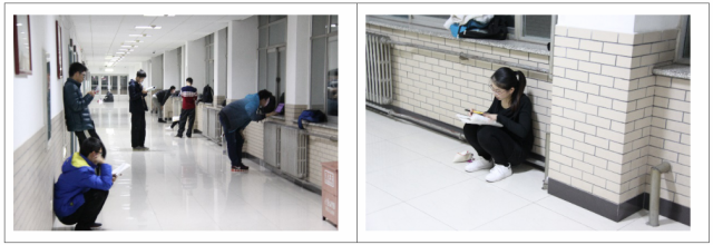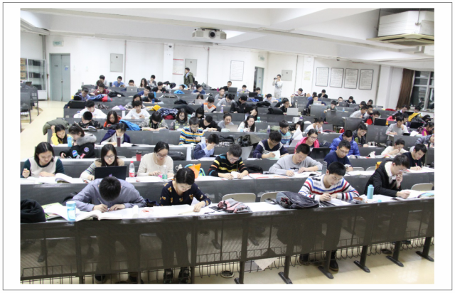 越来越多的同学自习使得4002已是非常拥挤,常常有同学搬简易凳子坐到教室后排,坐到门外大厅,甚至坐在、站在、蹲在信教的走廊里,然而,同学们传承发扬着延安精神,没有一个人叫苦,这里的人知道,所有此时的苦,都是在未来享用不尽的甜。