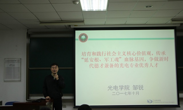2017年10月16日晚6:30,det365登录网站主页党委书记邹锐在良乡校区2-A206为2017级本科生讲授思政课,课程主题为《培育和践行社会主义价核心值观,传承“延安根、军工魂”血脉基因,争做新时代德才兼备的光电专业优秀人才》。