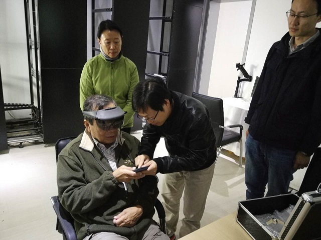 杨振寰教授试戴北理工研制的自由曲面棱镜式近眼显示器