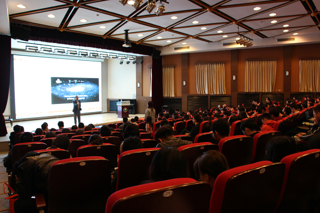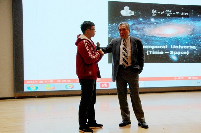 在第二个报告中,杨振寰教授在时序宇宙概念的基础上分析了时空量子纠缠的原理,通过类比量子纠缠与人们所熟知的合成孔径雷达,提出量子纠缠应该运作于类似于海森堡不确定原理的区间以内、以及量子纠缠会有能量损耗与时间延迟的观点,并因此推测根据现有的科学理论,远距离的即时量子纠缠会很难实现。杨振寰教授的讲座生动精彩,同学们积极提问与杨教授交流。