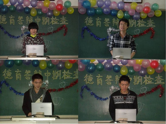本次及答辩会的主题是“让青春无悔”,会议由团支书宋磊同学主持。在一段总结过去两年中班级的集体活动的视频后,答辩会开始。同学们依次上台向大家分享自己这两年来的心路历程和对未来的展望。