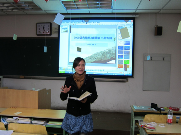 德育答辩当天,班主任徐丽老师、08级光电专业辅导员汤琪老师、09级光电专业辅导员盛筠老师认真听取了同学们充满激情、诙谐机智的答辩,并就同学们的答辩提出了具有深刻内涵的启发性问题,同时对个别同学的困惑给予了充满智慧的建议。会后,班主任徐老师对同学们提出了真诚的寄语“愿同学们把理想付诸实践,增强班级凝聚力,营造积极向上的班风学风;同时把自己塑造成德才兼备的新时代人才。”辅导员盛筠老师也语重心长地教育我们“要强化学习意识的培养,注意选择人生道路方向的重要性;多学习社会经验,拓宽眼界;多方面多角度的看待自己,发掘自己巨大的潜力。”最后盛老师将科比布莱恩的名言赠送给我们:You can do anything you want,if you really want it.