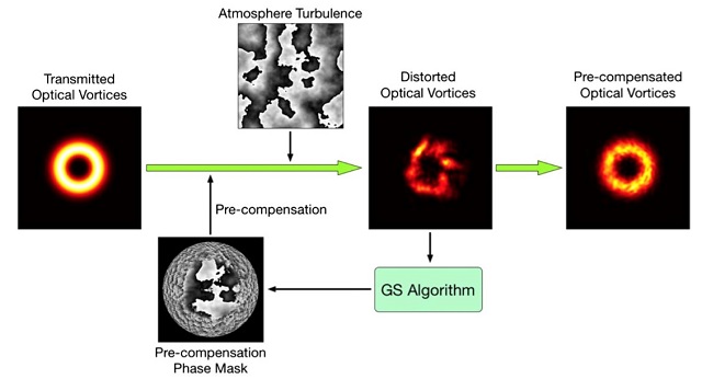 图2、涡旋光束的无波前探测无探针自适应畸变补偿原理