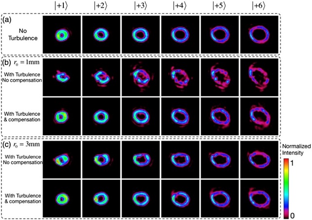 另外,该课题组还提出了一种无波前探测、无探针光束的涡旋光束自适应畸变补偿方法。他们采用面阵探测器直接采集经湍流传输后的畸变涡旋光场,通过设计的迭代算法由畸变的强度分布直接算出相位补偿屏,并将补偿相位作用于畸变涡旋光束,实现了涡旋光束的畸变补偿。实验结果表明,经补偿后,涡旋光束的OAM模式纯度有了显著提升,OAM谱展宽得到有效抑制。该结果以“Non-probe compensation of optical vortices carrying orbital angular momentum”为题,发表在Photonics Research [Vol. 5, Issue 3, pp. 251-255 (2017)]上。