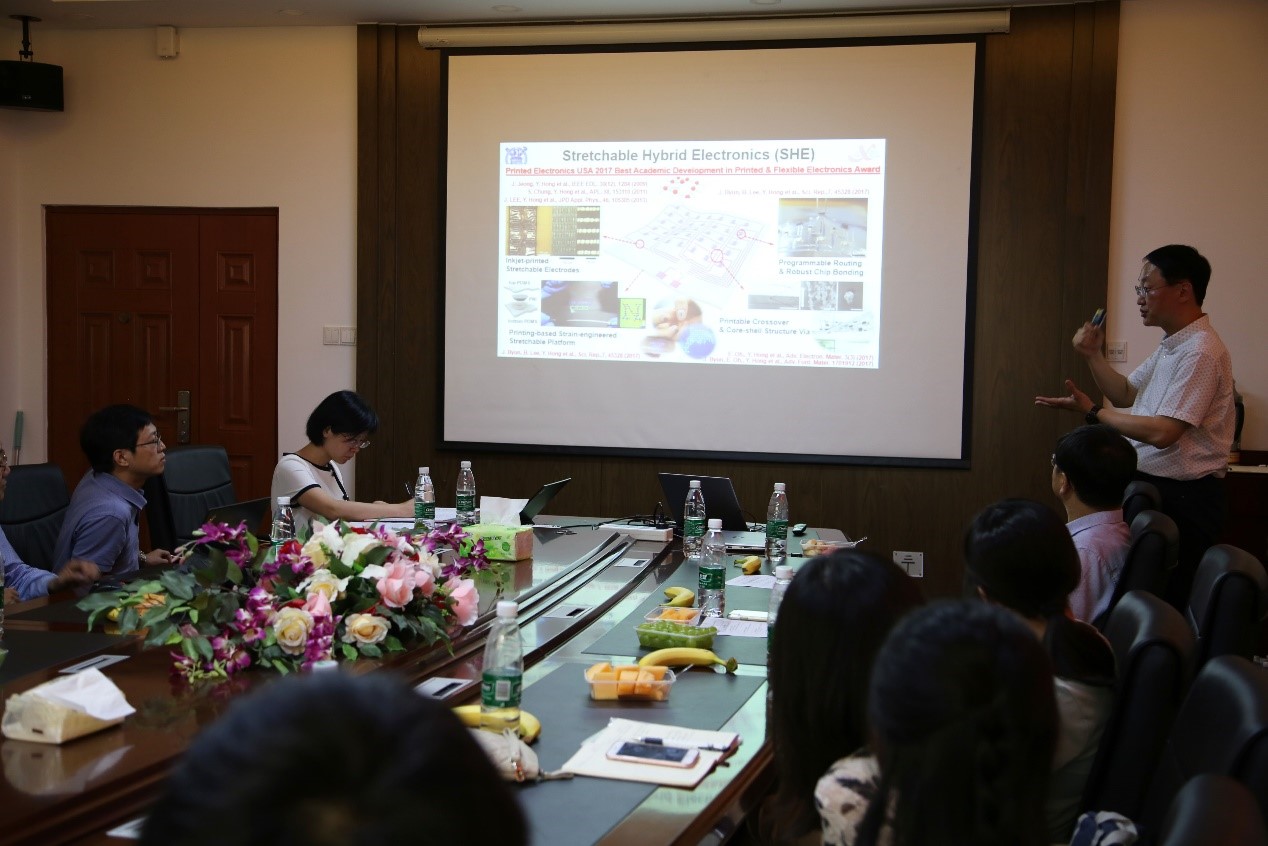 Yongteak Hong教授首先回顾了可穿戴技术的发展现状并对该项技术的未来发展趋势进行了展望。随后Hong教授介绍了基于印刷方法的可拉伸混合电子技术(SHE)的相关研究背景以及在可拉伸基底上实现电路板打印所需的多项关键技术。