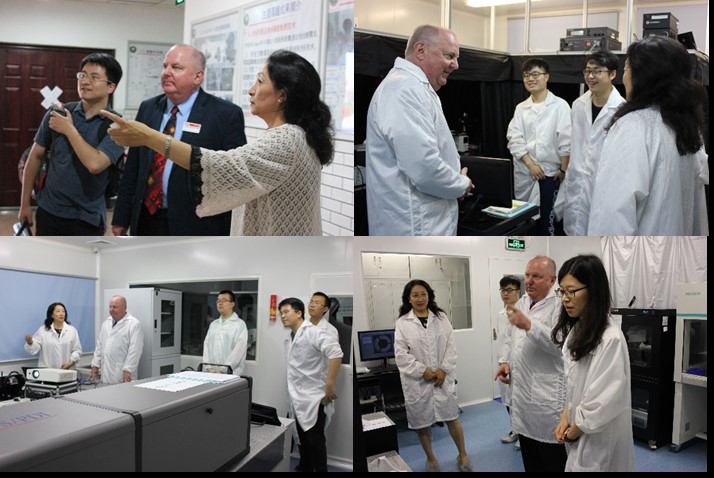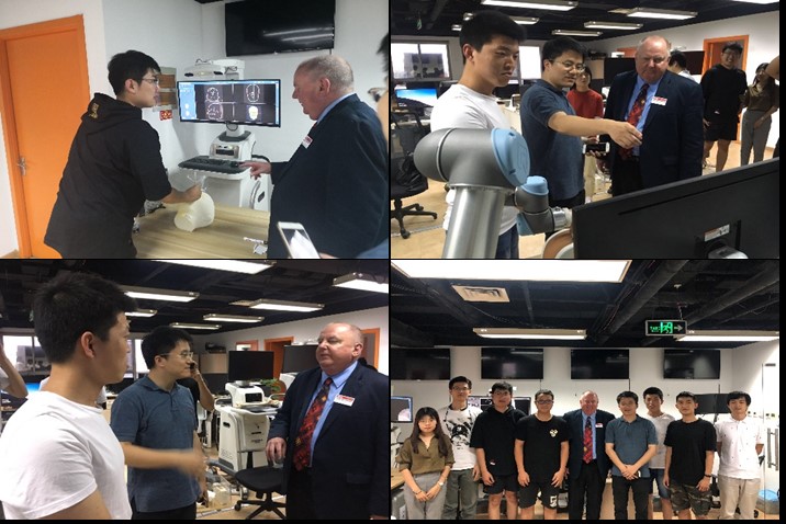交流访问期间,Greivenkamp教授还受邀参观了学院部分实验室与创新创业公司。首先,det365登录网站主页李艳秋教授向Greivenkamp教授详细介绍了课题组在高分辨光刻技术、偏振传感测量以及生物医学应用方面的概况与取得的应用成果。Greivenkamp教授与课题组研究生进行了深入交流,指导研究生如何开展科学研究。随后,Greivenkamp教授参观了王涌天教授团队杨健老师艾瑞迈迪医疗科技有限公司和程德文老师耐德佳科技有限公司。在艾瑞迈迪公司内研究人员向教授详细介绍了目前正在开发的基于增强现实的鼻内镜手术导航系统、超声引导肝脏肿瘤消融系统以及骨科导航系统。在耐德佳公司内研究人员向教授详细介绍了目前正在开发的头戴式轻便近眼显示系统。Greivenkamp教授十分赞赏我院在知识产权转化和社会服务中所取得的成绩。