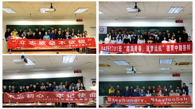 11月中旬起,det365登录网站主页本科2017级八个班分别开展了德育中期答辩交流会,同学们走上讲台,认真检验德育开题目标的完成情况,梳理入学以来的学习生活情况并对未来做出各自的展望。04281701班以“以梦为马,不负韶华”为主题,总结过去,畅谈理想。04251701班以“踏浪青春,筑梦远航”为主题,以班级特色活动为切入,共话班级情谊。04251702班以“追光逐电,志存高远”为主题,通过回顾德育开题时的目标,共同规划未来。04151703班以“立志欲坚不欲锐”为主题,开展了氛围融洽的答辩分享会。04261701、04271701班以“读好书,交好友,行远路、做大事”为主题,联合开展了答辩分享会。04151701、04161701班以“不忘初心、牢记使命”“Stay hungry,Stay foolish”为主题,认真梳理大学以来的成长与收获,并结合自身现阶段的学习生活深入剖析自身问题。
