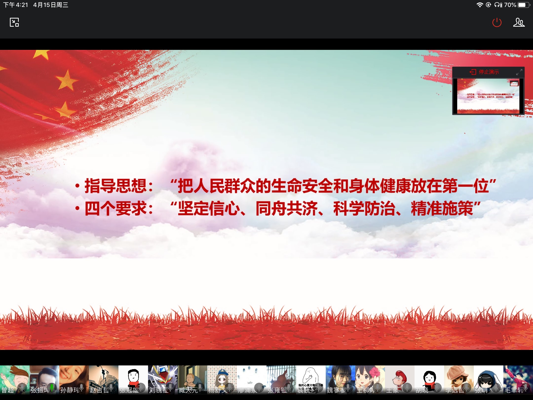 接着,支部李浪(湖北 仙桃)讲述了自己疫情期间自己伯伯的抗疫故事,紧挨着武汉的仙桃市,有大量人员在汉口务工,疫情爆发后这里自然也处在风口浪尖。李浪的伯伯是仙桃下属乡镇的干部,封城同时,镇上成立了作战小组,指挥全镇严防,所有干部假期取消。镇上搭上了帐篷来封锁各村入口和全镇主要交通要道,所有干部都有自己负责的卡口,李浪伯伯白天负责排查自己负责的村,查体温,排查人员行程,晚上就睡在路边用来封路的帐篷里。他家就在镇政府边上,但整个封城管控期间没有回过家一次。
