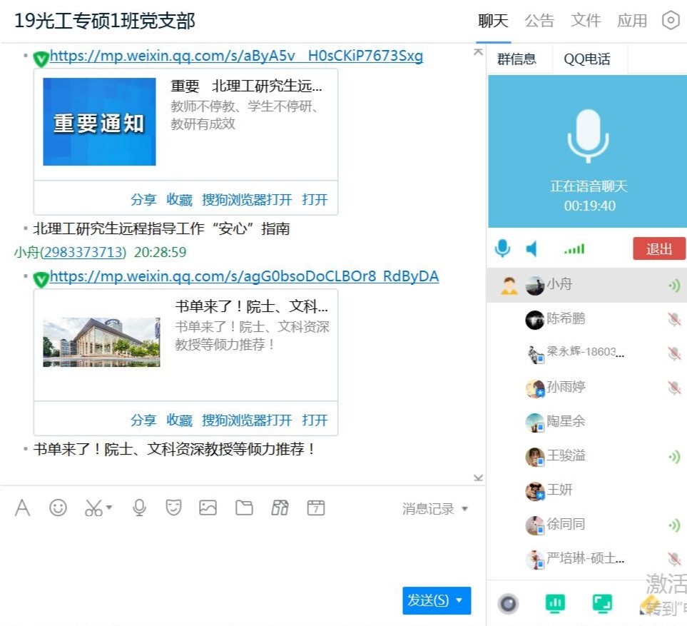 一边要服务社区,一边也不能放下学业和工作。对于研一新生,专业课是培养计划的重要部分。按时上课、完成作业、课后复习,远程教学期间李中石毫不松懈地完成课程任务。同时,初入实验室的他尽管不能返校开展实验,也积极联系导师和师兄师姐进行远程交流,充分利用学校的线上资源,努力保证科研工作的有序进行。此外,作为19级光工专硕1班党支部书记,他带领党员们在线上完成每月的支部理论学习,保持组织工作不间断。从二月底至今,他每天定时统计汇报班级同学填报的健康状态,还主动联系身在校外国外的支部成员,送上温暖。
