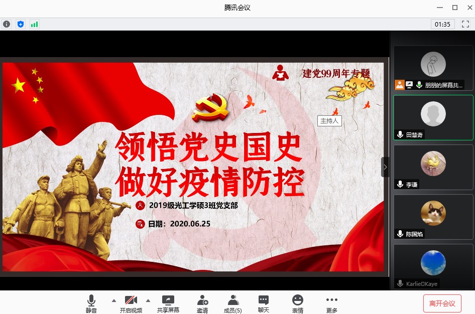 6月25日晚,支部开展线上理论学习会。今年是中国共产党建党九十九周年,疫情防控工作正处于关键阶段,支部学习回顾了我党的历史发展和历史贡献,分享了自己经历或身边的抗疫故事,共谈初心,致敬疫情防控工作者。
