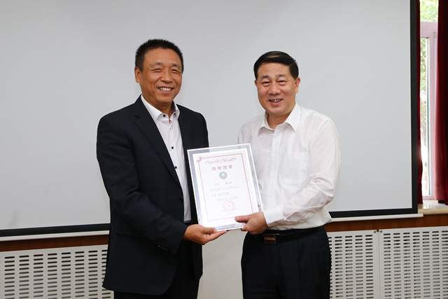 项昌乐代表学校向赫建校友颁发捐赠证书、赠送80周年校庆纪念品