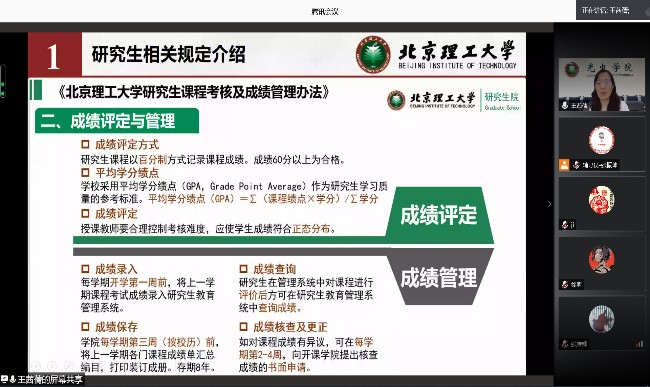 王茜蒨就研究生课程考核、成绩管理办法和学籍管理实施细则等做了详细介绍和指导。通过列举研究生教学管理和学术学风的案例,她要求同学们要明确自身学习目标,积极与导师交流沟通,严格遵守学术道德、学术诚信和科研保密规定。在学校学习期间,秉承“德以明理、学以精工”的校训,不断进取,助力自身成长成才。