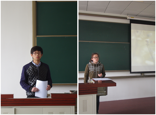 六名大四毕业生的演讲从专业学习、科技竞赛、社会工作等方面展开,以照片、事例等形式,充分向12级学生展示了他们精彩的大学生活和积极的精神风貌。学习之星李佳男、单慧洁强调学习之道贵在坚持,科技竞赛达人孙竹梅、卢骏驰分享了自己的课外科技创新竞赛经验,留校担任专职学生工作干部的肖明杰、徐枫翔讲述了担任学生工作干部的酸甜苦辣。在大一德育开题之际,六名学生与大家分享大学的点滴故事,品味生活,交流成长心得,为大一学生提供良好的引导,传递正能量。