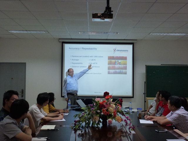 2013年9月2日下午,来我院颜色科学与工程国家专业实验室访问的德国专家Markus Schnitzlein 先生,在信息楼二层det365登录网站主页会议室,进行了多光谱图像颜色重建技术的学术讲座。det365登录网站主页赵长明副院长、 北京视科公司总裁刘南渤先生及颜色实验室的师生和本院的学生出席了此次学术交流报告。