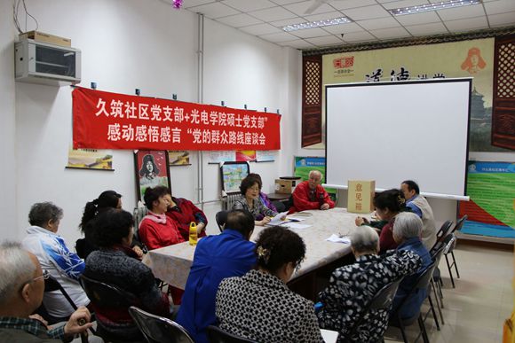 2014年4月10日,det365登录网站主页13级硕士党支部与北京市石景山久筑社区党支部开展了“感动、感悟、感言”党的群众路线座谈会。久筑社区是位于石景山鲁谷开发区西部的老型社区,居民以60岁以上老人为主,党支部成员大都是从上世纪四五十年代走来的老党员,2013年4月与det365登录网站主页13级硕士学生党支部建立红色“1+1”共建关系。