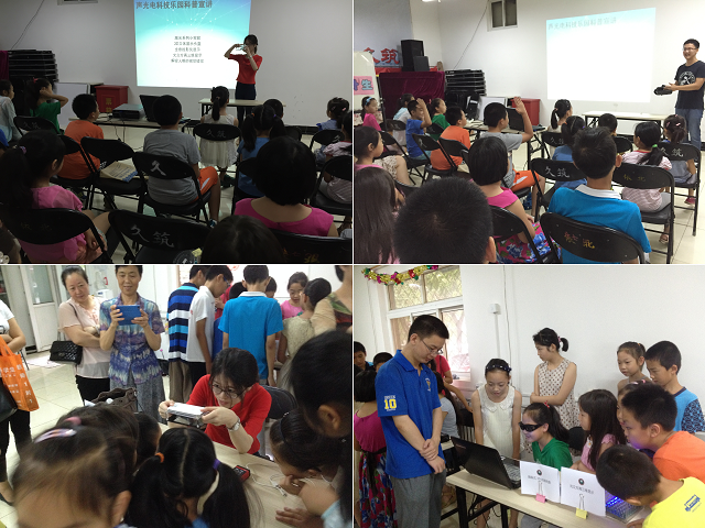 7月16日,两支部面向社区中小学生开展了以“声光电的科普乐园”为主题的科普进社区活动。此次活动的科普内容主要包括:激光系列小实验、激光测距仪展示、3D立体显示头盔展示、全息3D手机投影仪展示、光立方真三维显示展示、偏振式3D动画电影欣赏、揭秘人眼视觉错觉科普讲座等。大学生党员为孩子们一一介绍了这些仪器中所包含的物理知识,并做现场演示,引得孩子们一阵阵惊叹。本次活动把支部共建与专业特色紧密结合起来,为社区中小学生和家长搭建了一个了解光电最新科技产品的平台。