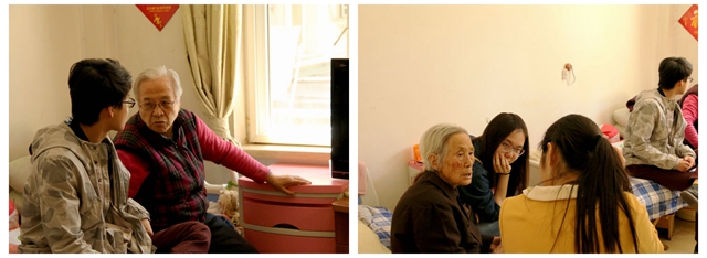 学生服务中队一行受到敬老院方面的热烈欢迎。敬老院吕院长介绍了敬老院的基本情况,安排了本次活动的座谈交流会。老人们精神抖擞,看到志愿者们都很高兴。从人生经验到社会变迁,从红色历史到民俗风情,老人们向同学们敞开心扉,畅所欲言。老人们讲得神采飞扬,同学们听得津津有味。