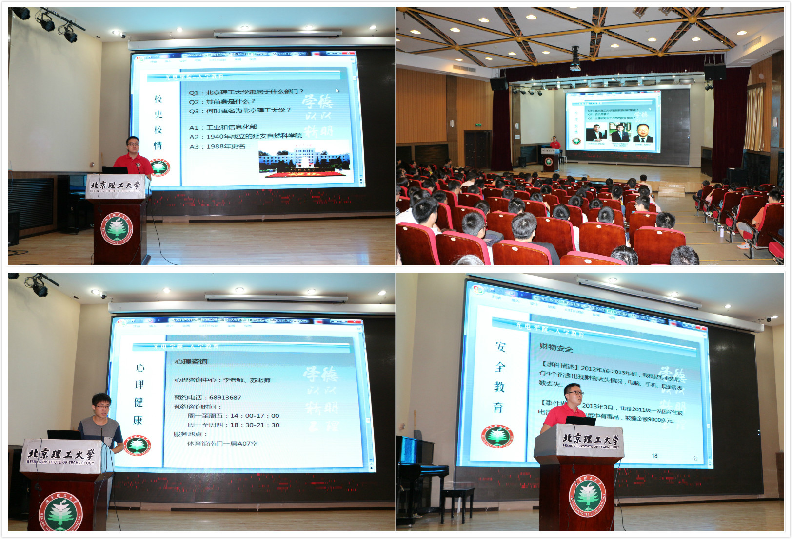 接下来,学生辅导员袁博和宋若鹏就校史校情、学院概况、规章制度、办事指南、心理健康和安全教育等几个方面做了详细的介绍,旨在让刚刚进入学校的研究生新生快速了解了学校学院相关政策与概况,帮助他们尽快进入研究生角色,展开研究生阶段的教学、科研以及生活。