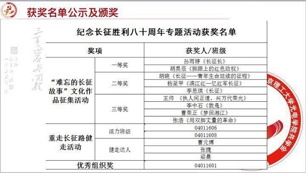 讲座结束后,det365登录网站主页共学会负责人向同学们介绍了纪念长征胜利80周年系列活动成果并通报了获奖情况。学院评出“难忘的长征故事”文化作品征集活动一、二、三等奖9个,“重走长征路”健走活动“活力班级”2个、“健走达人”3个,“优秀组织奖”1个。