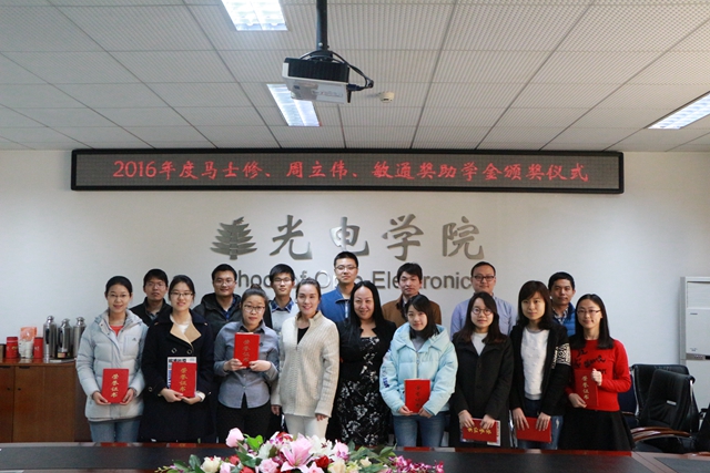 周霞老师首先介绍了学院捐助奖学金的设置情况以及奖学金评选的相关事宜,介绍了周立伟奖助学金的设置目的,并向获奖同学表示了祝贺。盛筠老师宣读了2016年度学院社会捐助类奖学金获奖名单,并鼓励同学们向马士修等光学前辈学习,不断创新,积极投身光电事业。