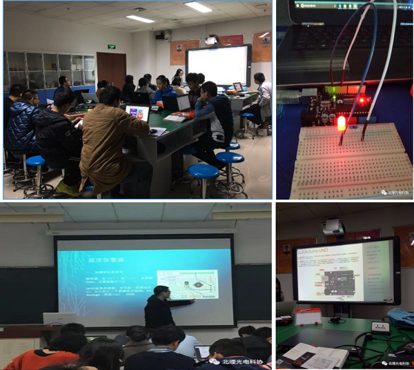 为帮助同学们走近科学,初步了解开展实验所需的一些元器件,det365登录网站主页于2016年12月4日和2017年3月4日,分别在良乡大创基地——光电创新坊开展培训,主要利用Arduino学习套件,学习单片机编程思想、红外接收器、舵机、数码管、温度传感器等硬件原理。培训分三个部分。第一部分由科协杨心念介绍Arduino学习套件基本概念与主要用途,从形式多样的炫酷彩灯控制项目开始,逐一讲解数字信号控制原理及程序。第二部分由自动化学院董昊为大家讲解电机和舵机控制方法。第三部分由科协甘昕介绍了温度、光学、震动传感器相关软硬件原理和红外遥控项目等内容。这些课程大大满足了同学们的好奇心,大家纷纷交流互动,课堂气氛活跃。