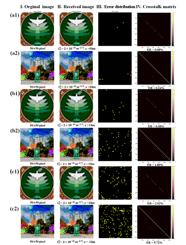 为了验证基于以上模型的编-解码性能,实验传输了50×50像素的彩色图像。图像的三色维度RGB分别被分为5个色度级,共构成125种色度信息,分别由125种HG模式相干叠加态进行编码。同时,还将大气湍流带来的不同程度的相位抖动通过DMD空间光调制器一并加载至这125种模式上,并通过深度学习技术加以训练形成数据集。图2 I~IV分别为原始图像、接收图像、误差分布(用黄色方块标记)和对应的串扰矩阵。