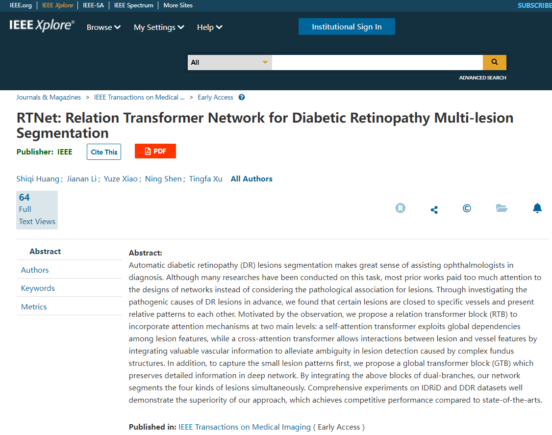 近日,det365登录网站主页许廷发科研团队在眼底医学图像处理领域取得新突破,相关研究成果以“RTNet: Relation Transformer Network for Diabetic Retinopathy Multi-lesion Segmentation”为题发表在医学图像处理领域的国际顶级期刊《IEEE Transactions on Medical Imaging(IEEE TMI)》(IF=10.332)上,IEEE TMI是医学图像处理领域具有高影响力的国际学术刊物之一,在2021年该领域270余种JCR期刊中排名前列,影响因子为10.332,中科院一区,主要发表和报道医学图像处理和分析、可视化和性能等领域的最新研究进展。该工作第一作者为det365登录网站主页博士研究生黄诗淇,通讯作者为det365登录网站主页许廷发和李佳男。