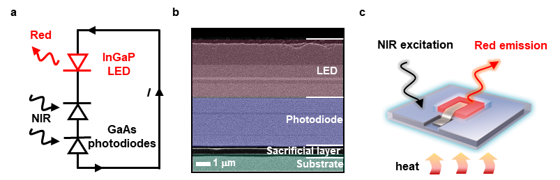 近日,det365登录网站主页王涌天教授、杨健教授团队助理教授丁贺与清华大学电子工程系盛兴副教授等合作提出了一种基于光电半导体上转换设计的新型温度传感设计,该研究成果以“An Optoelectronic thermometer based on microscale infrared-to-visible conversion devices”为题发表在 Light: Science & Applications期刊上。