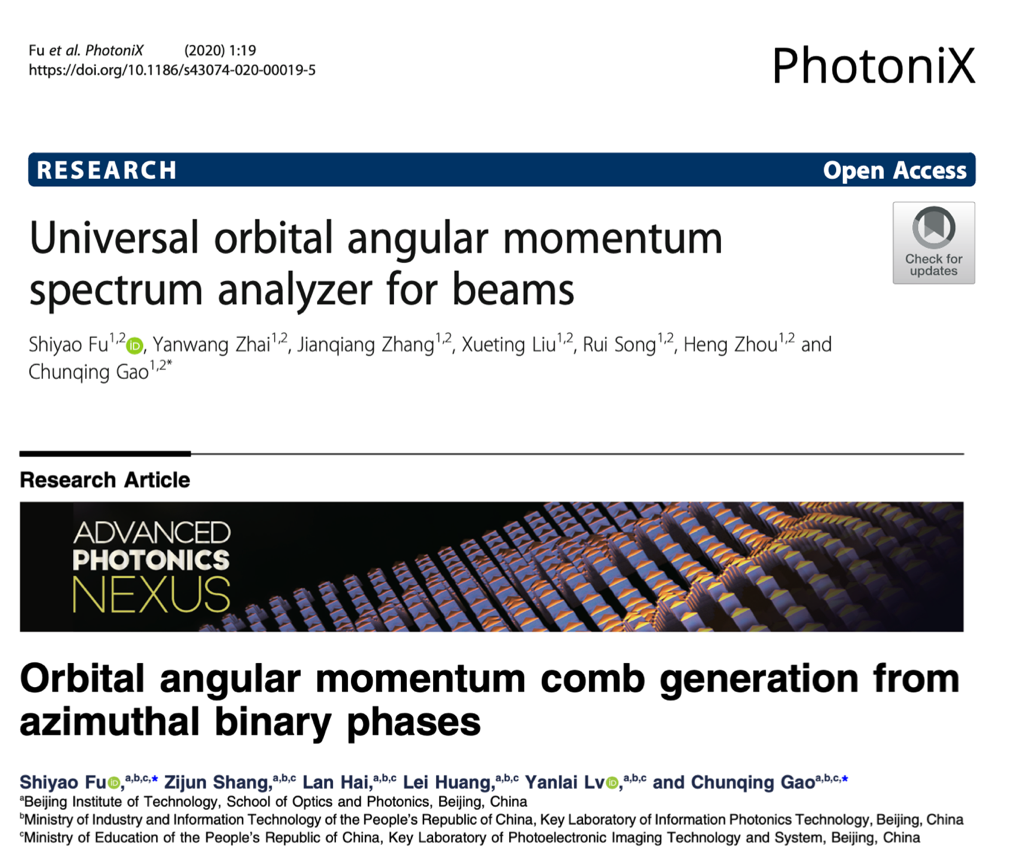 OAM光梳是一种在“l域”中由等模式间距的一系列分离OAM模式构成的复杂光场结构,其为超高光子效率信息编码的载体,同时也是高密度全息加密技术的“钥匙”。先前研究已经证明,采用纯相位调制方法不可能将基模高斯光束转化为OAM光梳,若要获得OAM光梳,则必须采用迭代等方法无限逼近,而迭代过程是费时的,将高维信号编码的优势抵消殆尽。针对这一问题,该团队从达曼光栅技术获得灵感,构建了x坐标与φ坐标的映射关系,研制了角向二值化相位结构衍射光学器件,最终实验获得了127维OAM光梳,模式均匀性达92.04%,如图1所示。由于不同的OAM光束对应固定的角向二值化相位的相位跃变点坐标,使得可根据数值解而无需任何迭代运算即可生成任意OAM光梳,有效的解决了现有技术生成高维OAM光束响应时间长的问题。该团队公开了不同OAM光梳下角向二值化相位的相位跃变点坐标数值解,可供本领域科研及技术人员直接调用。该工作为高维涡旋光场调控提供了全新思路,发表于CLP与SPIE新办刊物Advanced Photonics Nexus,并被选为AP Nexus创刊首期封面,如图2所示。付时尧副研究员是该文的第一作者及通讯作者,高春清教授为该文的共同通讯作者。