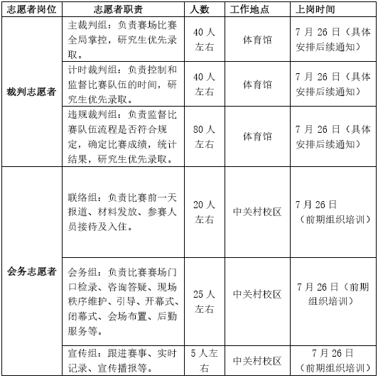注:志愿者工作由组委会汇总志愿者报名情况统一安排分工,各岗位志愿者应随时准备到需要的位置上进行补充,以应对突发状况。