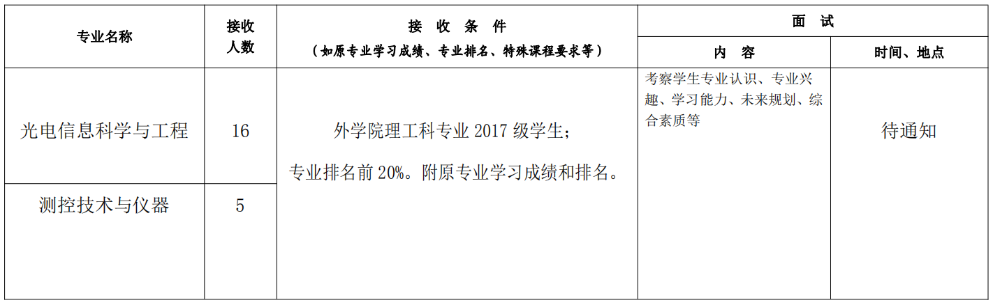 2、 det365登录网站主页现有本科专业为:(1)光电信息科学与工程;(2)测控技术与仪器。本次仅受理本校外学院理工科专业2017级学生申请转入,转入学生进入我学院2017级学习;
