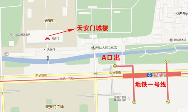 乘坐地铁1号线在天安门东站下车,出西北方向的(A口)站口向西约300米处即是天安门城楼;也可乘坐相关线路公交车在天安门东站下,步行至天安门售票处集合点。