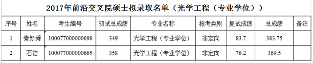 2017年前沿交叉院硕士拟录取名单(光学工程(专业学位))