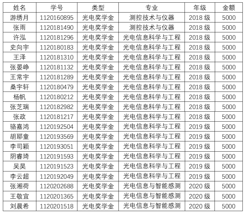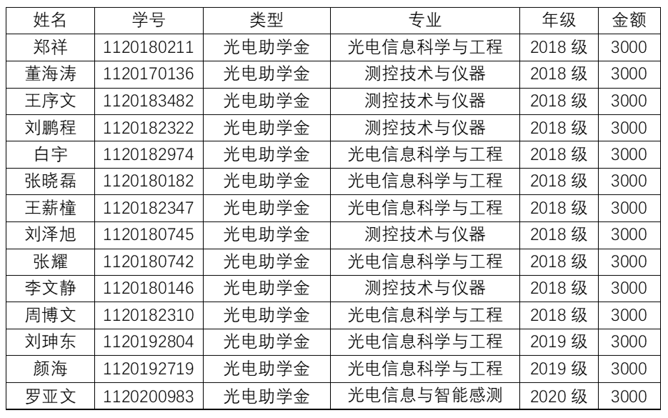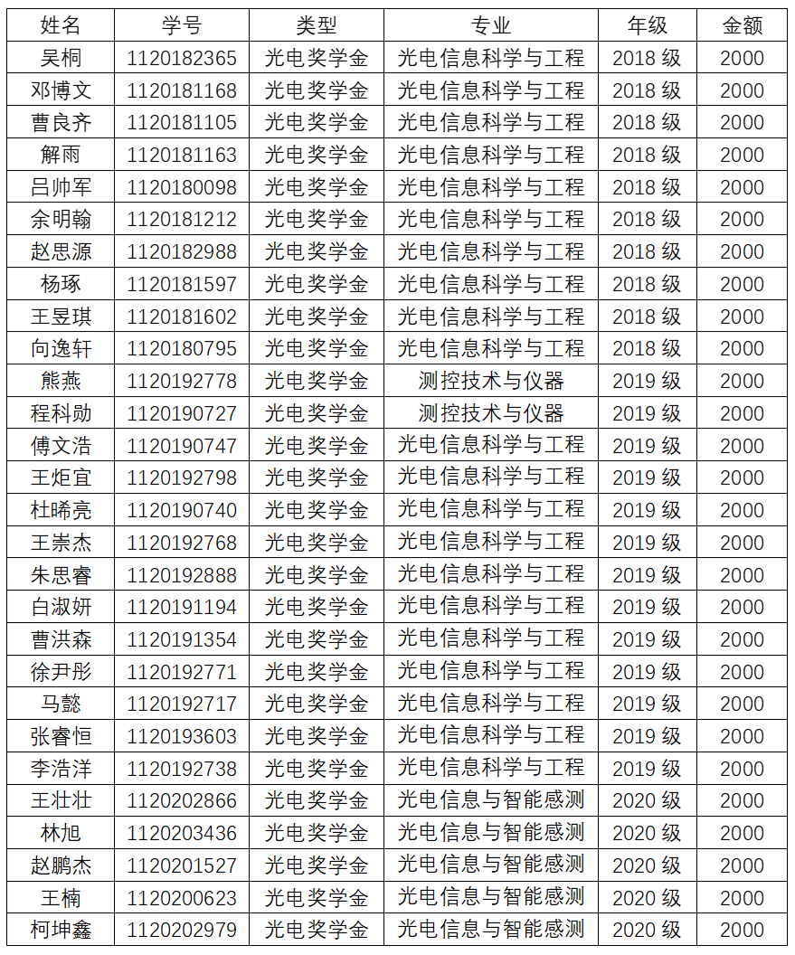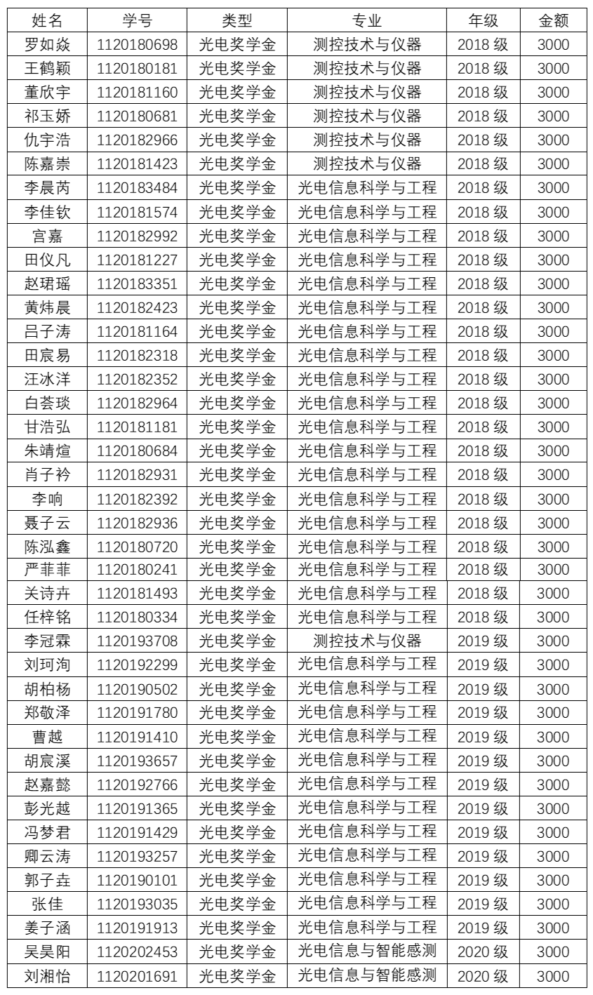 为促进det365登录网站主页人才培养工作发展,det365登录网站主页校友刘伯丰出资设立“光电奖助学金”,用以奖励资助光电专业成绩突出和家庭经济困难的本科生圆满完成学业。经“光电奖助学金”评审委员会讨论通过,光电奖学金有89人入围,其中一等奖20名,二等奖40名,三等奖29名;光电助学金14人入围。经11月29日-12月1日公示之后,现将最终评定结果通知如下: