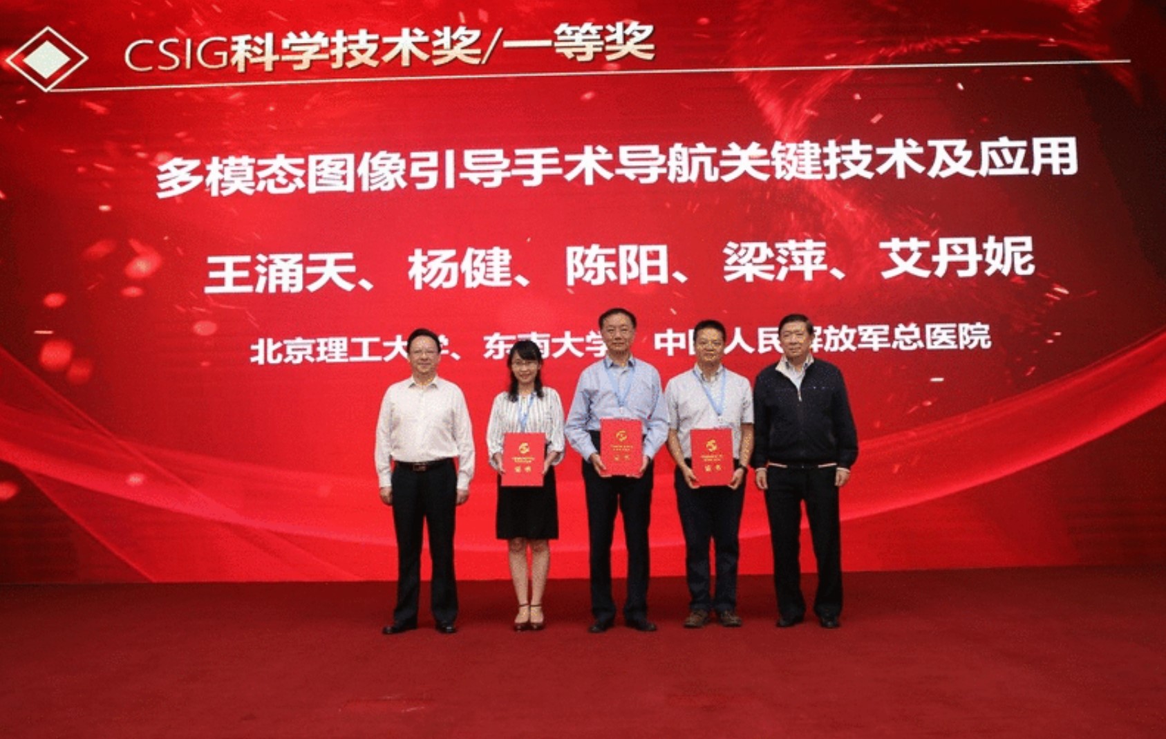 2018年度中国图象图形学学会颁奖典礼于2019年8月24日在北京友谊宾馆隆重召开,徐冠华院士和谭铁牛院士为2018年度中国图象图形学学会科学技术奖代表颁奖。det365登录网站主页王涌天教授、杨健教授、艾丹妮副教授组成的研发团队与东南大学、中国人民解放军总医院展开深度合作,共同完成“多模态图像引导手术导航关键技术及应用”项目,在中国图象图形学学会科学技术奖中荣获唯一一等奖。